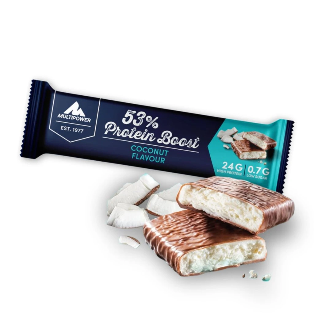 Die neuen 53% Proteinriegel von Multipower haben eine erhöhte Proteinkonzentration und ein verbessertes Rezept. Mit 24g Protein pro Riegel unterstützt es den erhöhten Proteinbedarf während intensivem Training.